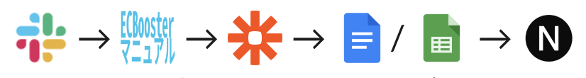 これらの課題を一気に解決するために、Slack、Zapier、Google ドキュメント(Google スプレッドシート)、そして Google NotebookLM を連携させた新しい情報共有のワークフローを導入しました。