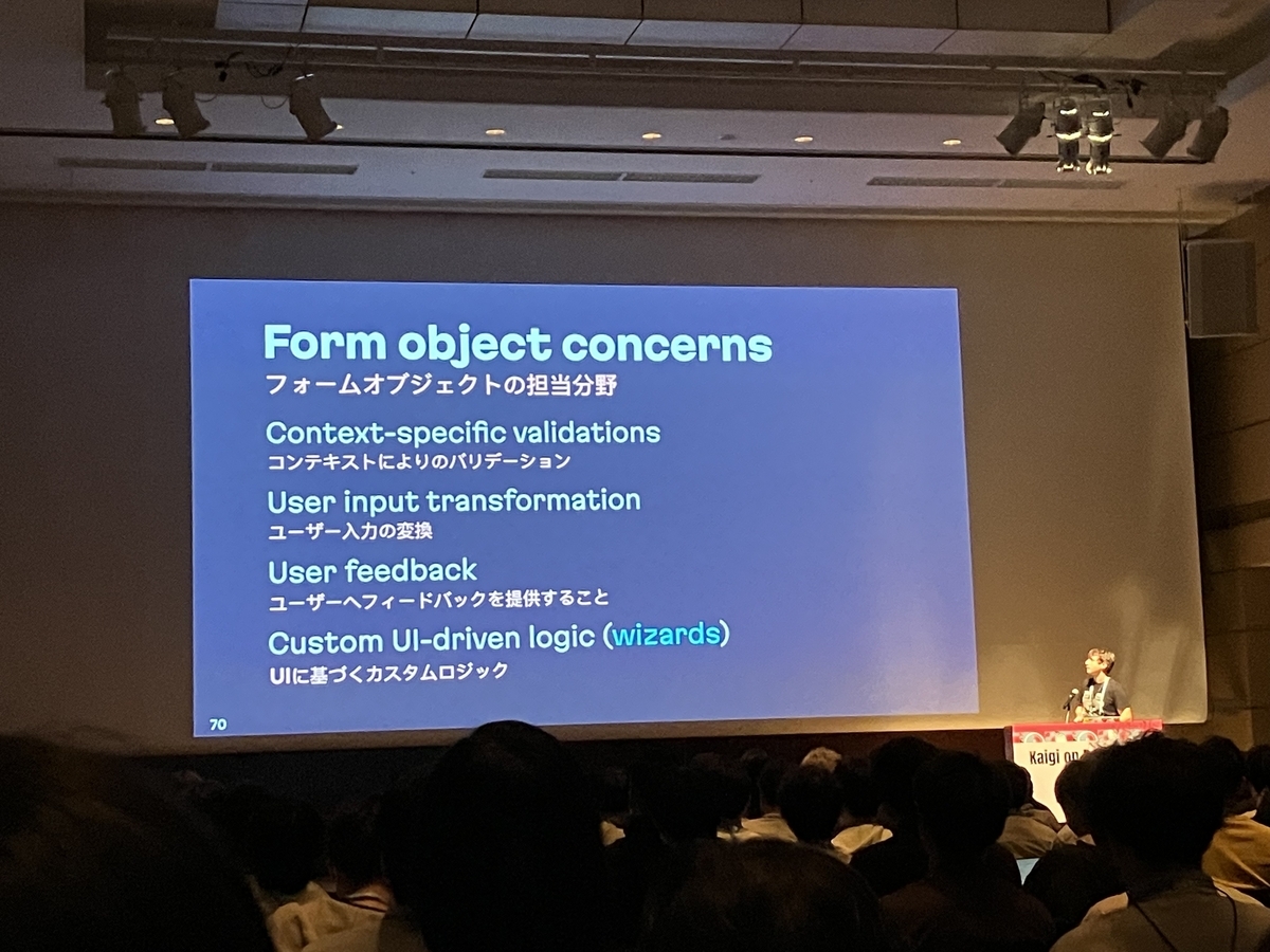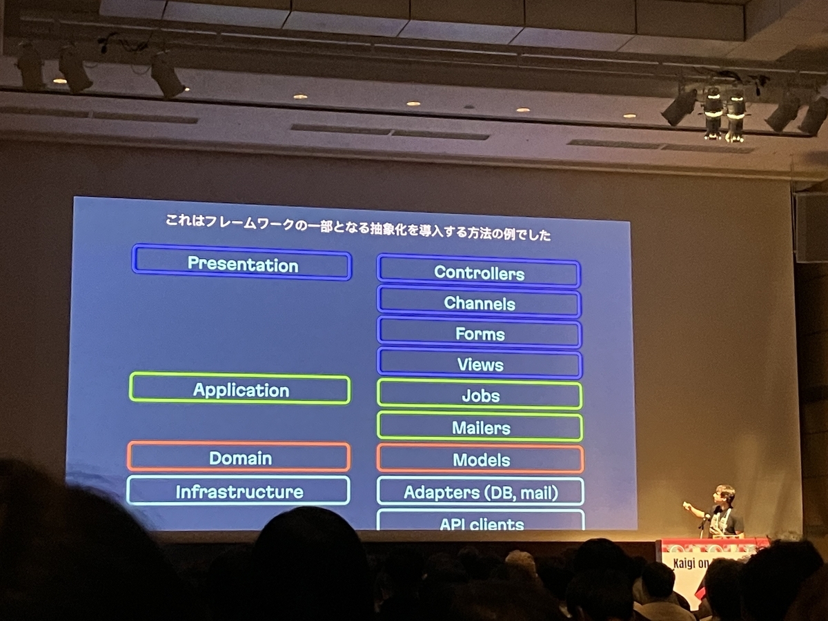 「Rails Way, or the highway」というテーマで、Rails を他のものと混ぜるのではなく、拡張していくアプローチについての基調講演がありました。 フレームワーク作者の視点を持ち、Presentation・Application・Domain・Infrastructure といった抽象化レイヤー間の明確な境界設定や、既存の抽象化からの抽出の重要性が解説されました。 特にフォームオブジェクトの担当分野の明確化や、全ての抽象化におけるベースクラスの必要性など、実践的な知見が共有されました。